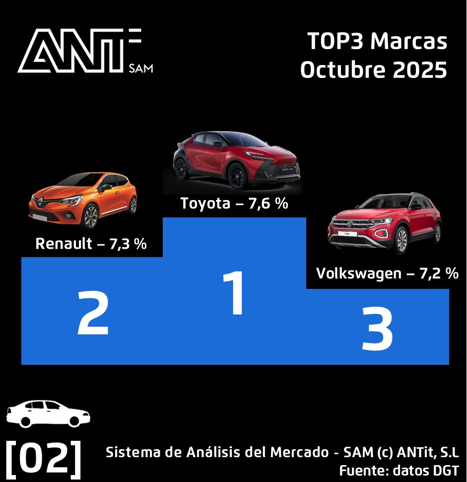 🚗 𝗘𝗻 𝘁𝘂𝗿𝗶𝘀𝗺𝗼𝘀 + 𝗧𝗧: se cierra el mes con una cifra de 96.579. Toyota España, S.L.U. lidera este mercado con una cuota de un 7,6 %. Este mercado crece respecto al mes de octubre de 2024 un 16,0 % y un 13,6 % respecto al mes de septiembre de este año.