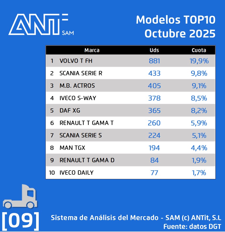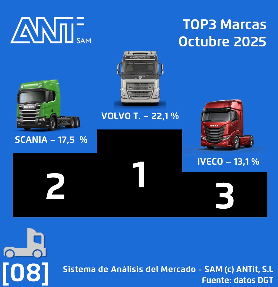 🚛 𝗘𝗻 𝗶𝗻𝗱𝘂𝘀𝘁𝗿𝗶𝗮𝗹𝗲𝘀: cierra el mes con una cifra de 4.429 matriculaciones, lo que significa un descenso del 3,6 % en comparación al mismo mes de hace un año y un crecimiento respecto al mes de septiembre de 2024 del 28,5 %. Como líder del mercado en este mes tenemos a Volvo Trucks España con una cuota de un 22,1%.