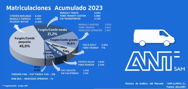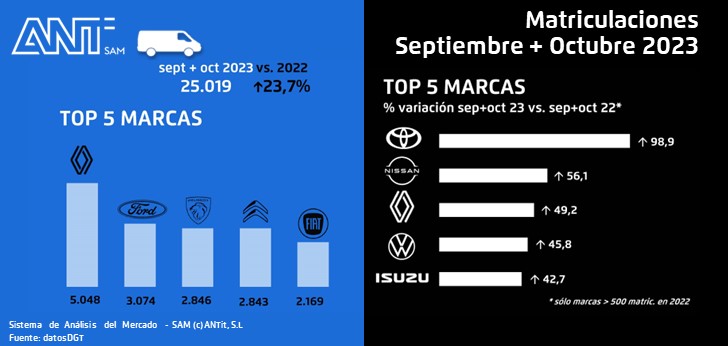 Este incremento se reparte entre casi todas las principales marcas del mercado. Ocho de las diez primeras marcas están registrando crecimientos de dos dígitos en sus matriculaciones en lo que llevamos de 2023, especialmente Renault (+48% respecto de 2022), única marca que supera ampliamente las 20.000 matriculaciones y es la marca dominante en los 3 principales segmentos: furgón pequeño (modelos Express y Kangoo), furgón medio (Trafic) y furgón grande (Master).