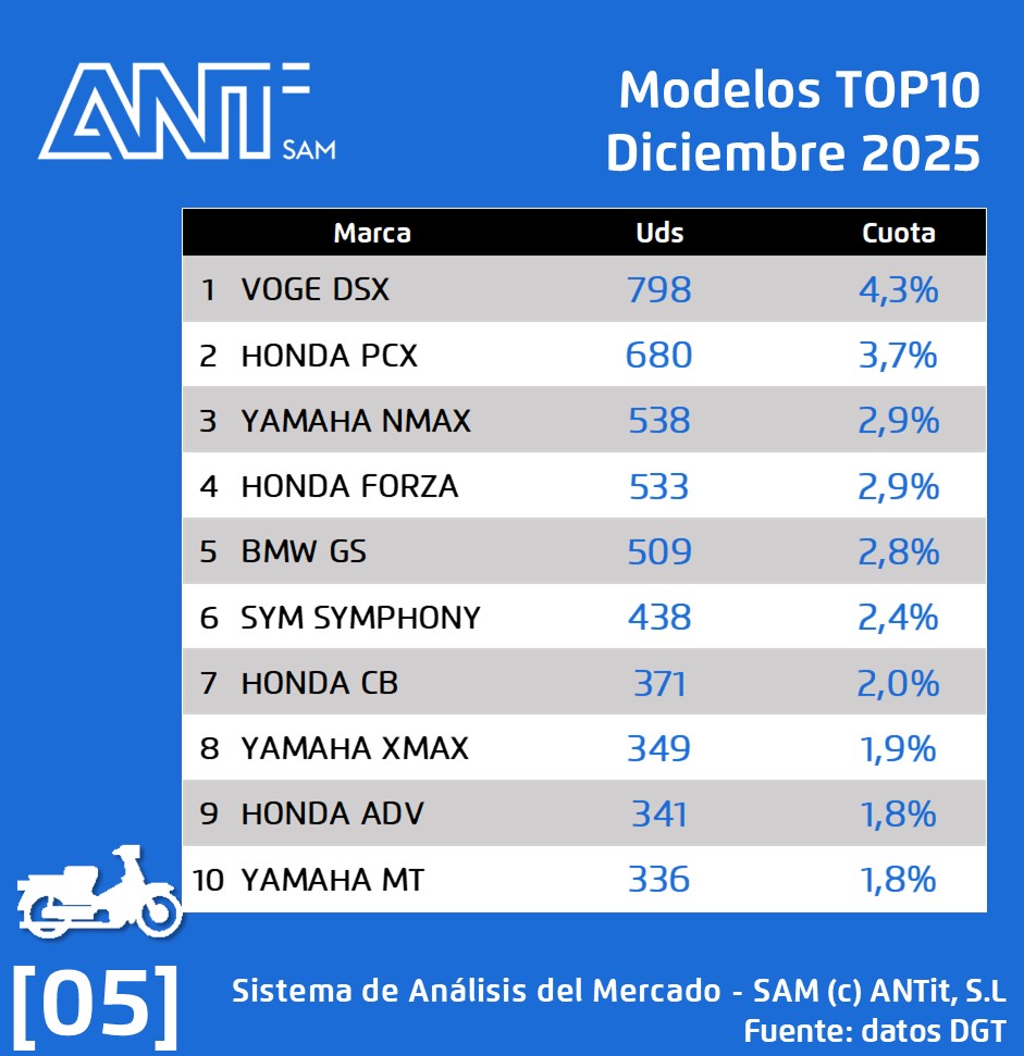 🛵 𝗘𝗻 𝗺𝗼𝘁𝗼𝘀: la cifra de cierre de mes es 18.521 matriculaciones, esta cifra supone un decrecimiento de un 23,6 % respecto a diciembre de 2024 y un 9,4 % respecto al mes de noviembre de 2025.