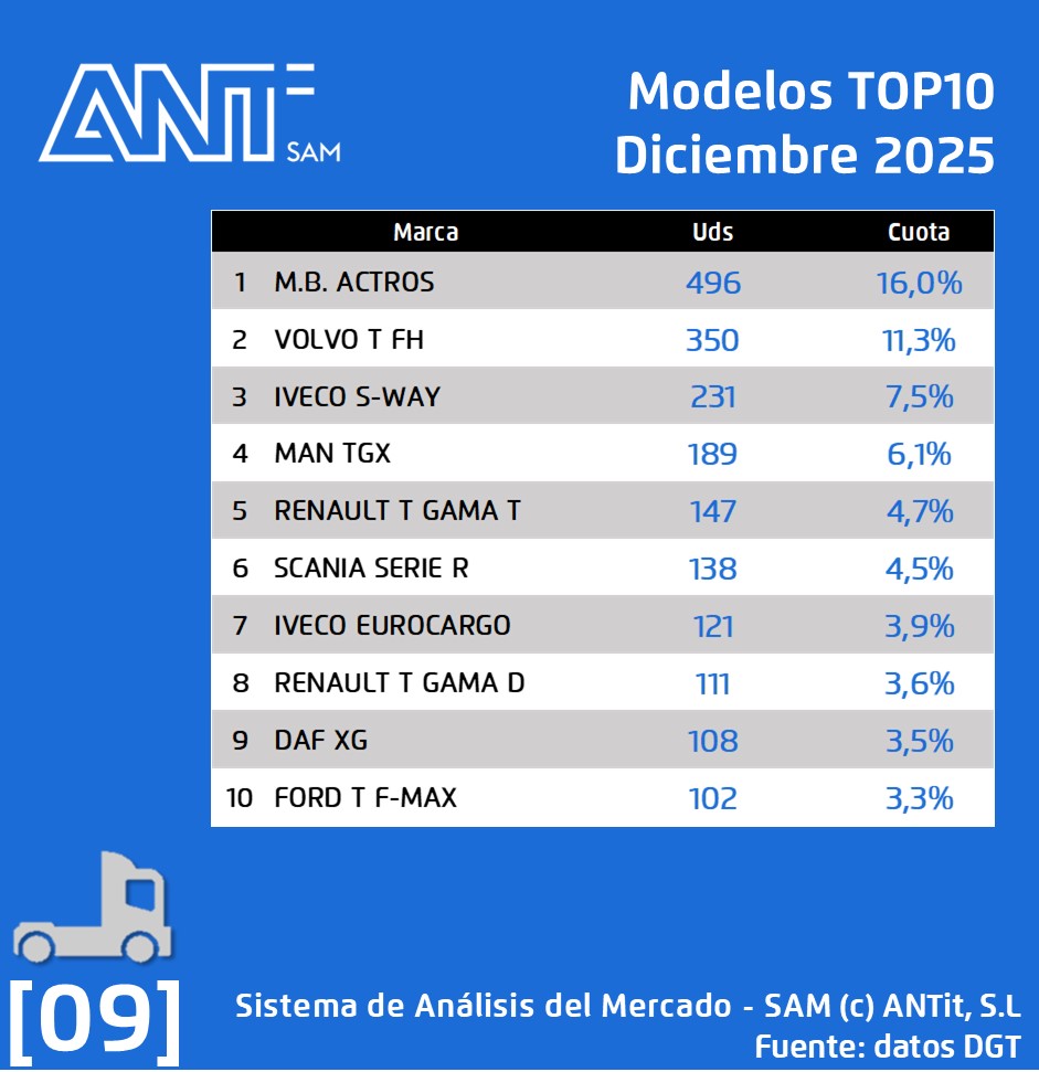 🚛 𝗘𝗻 𝗶𝗻𝗱𝘂𝘀𝘁𝗿𝗶𝗮𝗹𝗲𝘀: se cierra el mes con una cifra de 3.102 matriculaciones, lo que significa una subida de un 40,1% respecto al mes de diciembre de 2024, respecto al mes de noviembre de este año este mercado cae ligeramente en un 0.1%. Como líder del mercado en este mes tenemos a Daimler Truck AG con una cuota de un 22,0%.